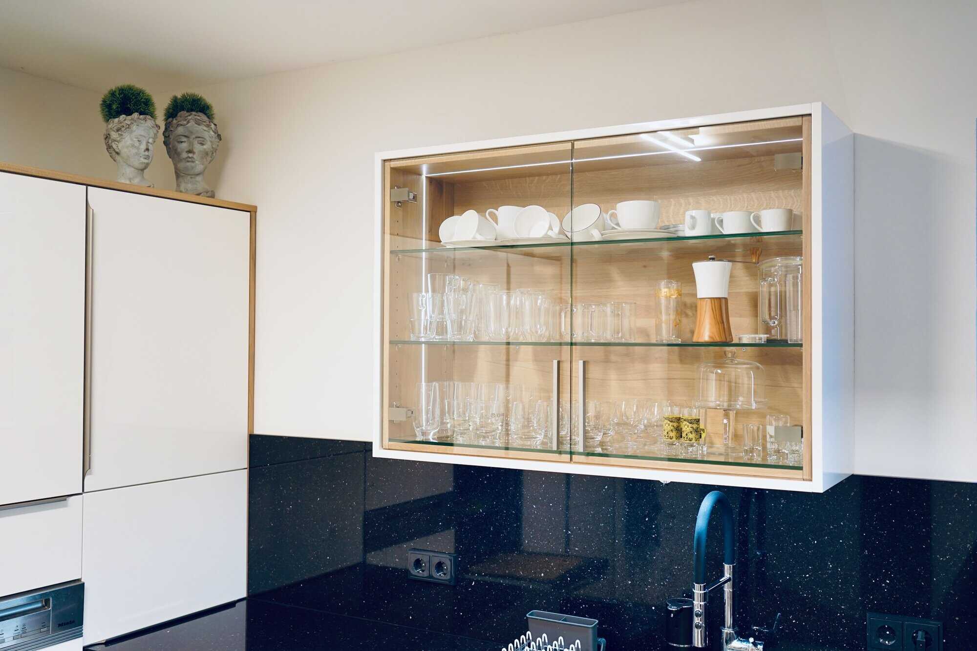 • Material-Mix: Hängeschränke mit Glastüren und einem Korpus aus massiver Eiche, deren natürliche Äste und Risse edel dunkel gespachtelt wurden.