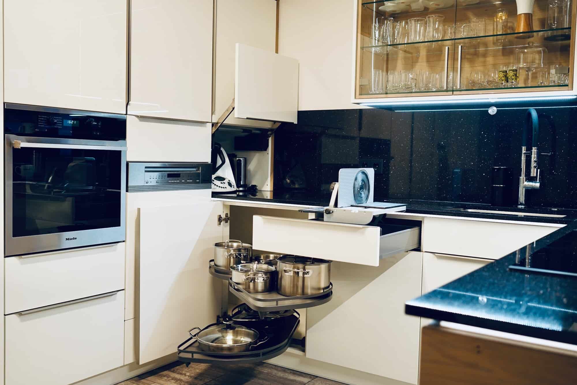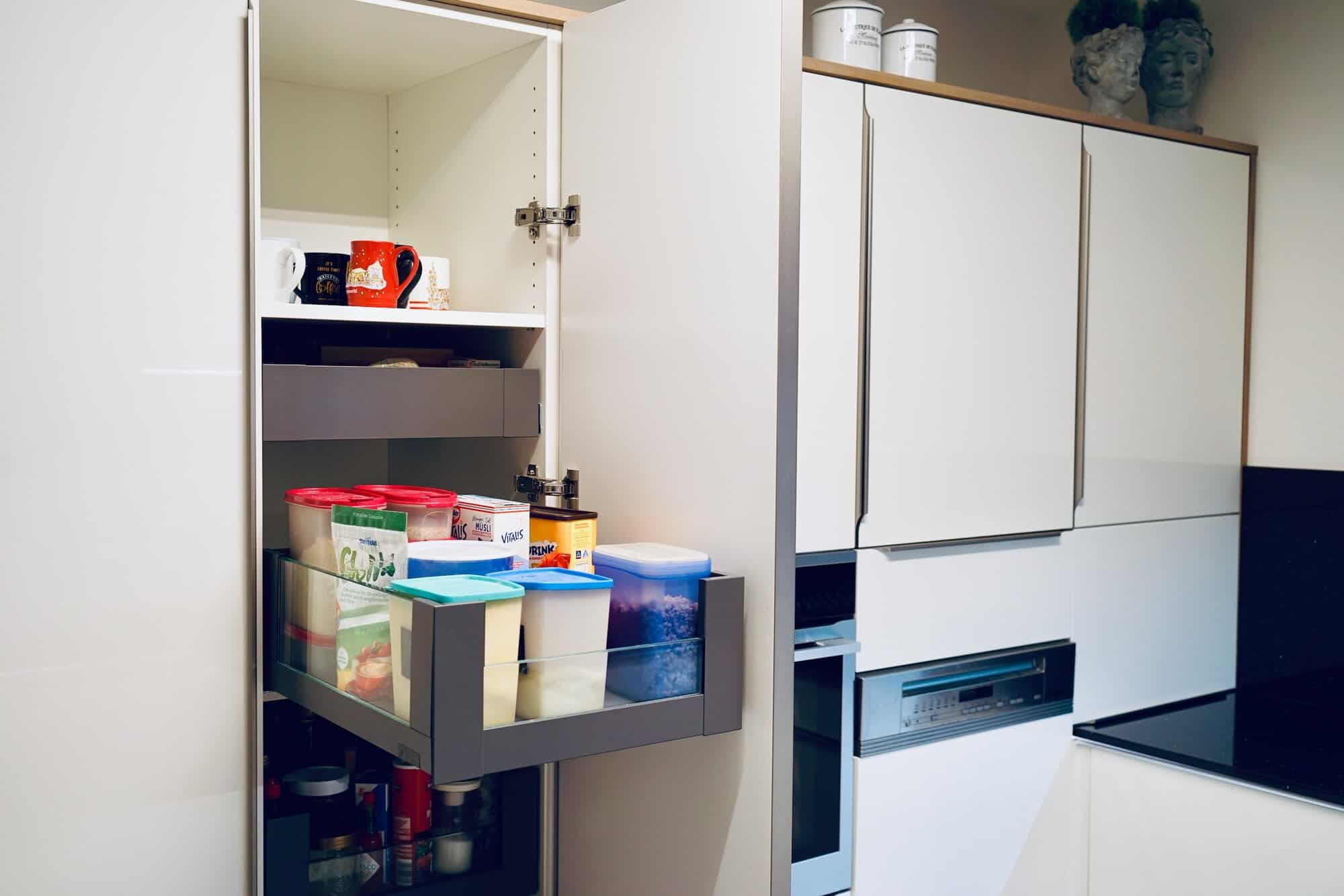 • Stauraum-Spezialisten: Der „Space Tower“ Vorratsschrank mit einzeln zu öffnenden Auszügen und der „Le Mans“ Eckschrank-Schwenkauszug nutzen jeden Winkel optimal aus.