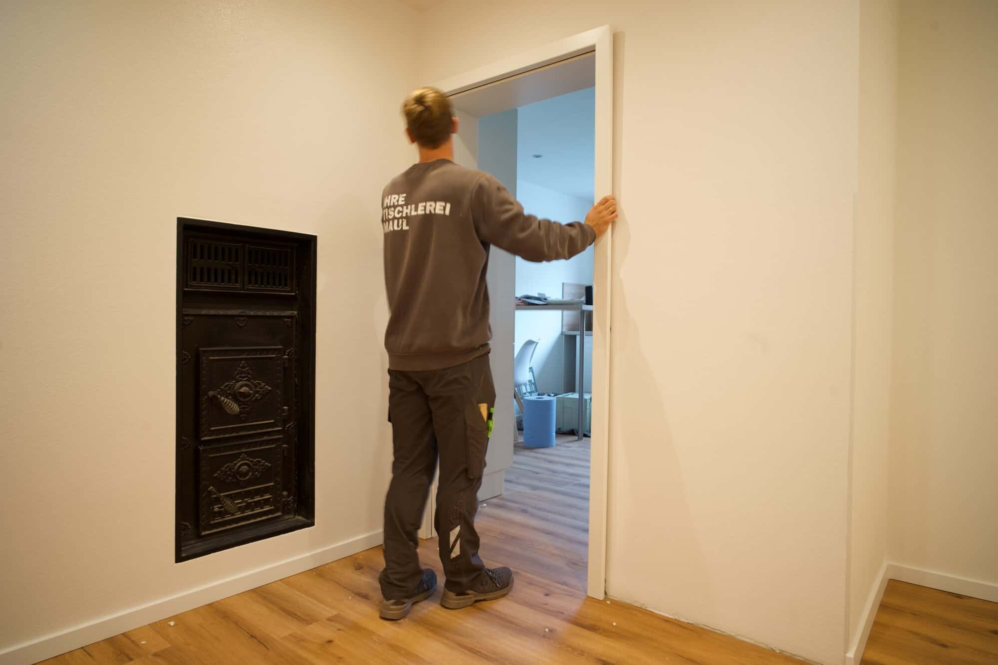 Wir montierten die Türelemente fachmännisch mit 2-K-Zargenschaum. Das fachgerechte Ausrichten der Türen und die Justierung aller Beschläge für leisen, sauberen Türlauf ist für uns selbstverständlich.